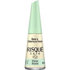 A Base e Cobertura Fosca da linha Risque Care proporciona efeito matte fosco. Tem funcao 2 em 1 pode ser usado como base e ou como cobertura. Risque Care e uma linha de cuidados completa do inicio ao fim. Conta com 7 produtos em sua linha. todos eles com oleos naturais. Um cronograma de cuidados antes. durante e depois da esmaltacao.