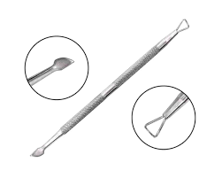A espatula para cuticula e feita em aco inox e possui dois lados. um para empurrar a cuticula e o outro para limpar e finalizar as unhas.