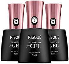 O Esmalte Risque Diamond Gel possui alto brilho e durabilidade. O pincel contem 800 cerdas o que aumenta a cobertura e precisao na aplicacao do esmalte. Sua formula hipoalergenica e livre de substancias que causam alergia. Para garantir o efeito gel. apos a aplicacao do esmalte com cor Passo 1 . passe o Top Coat Fixador Diamond Gel Risque Passo 2 . que foi criado especialmente para proporcionar a durabilidade e alto brilho.