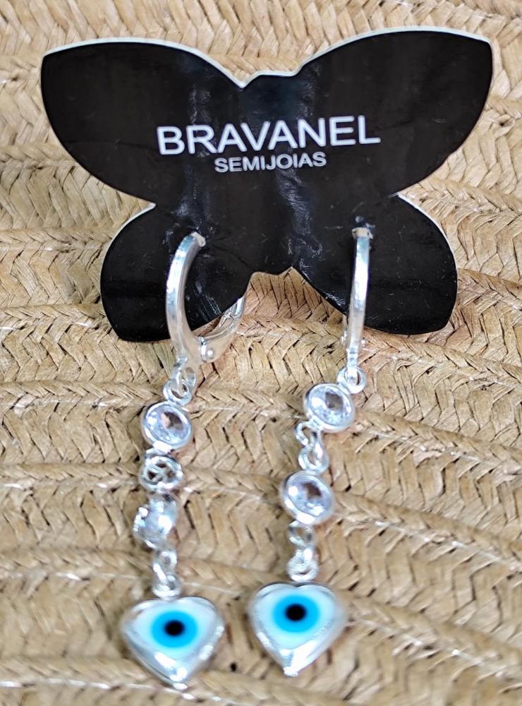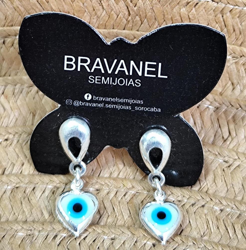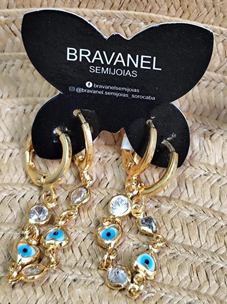 Brinco de argola dupla coração olho grego pendurado e ponto de luz dourado