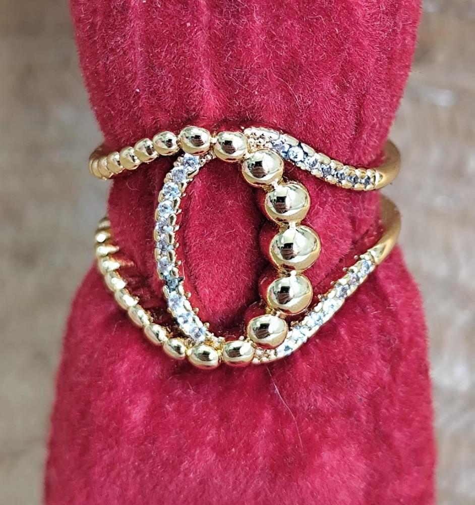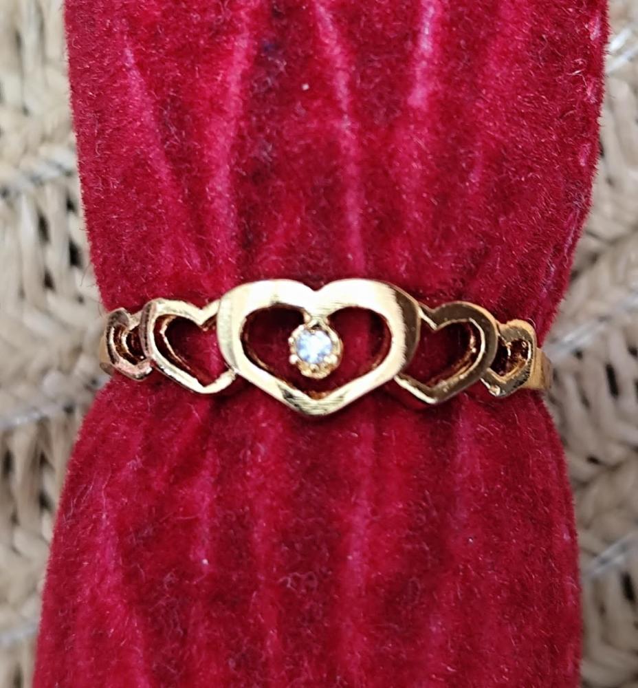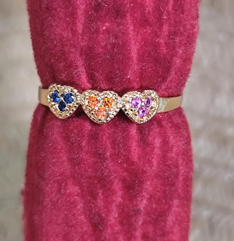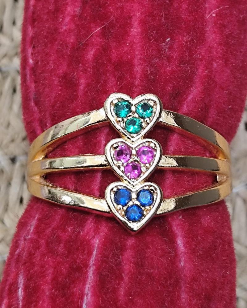 Anel triplo liso e vasado com 3 corações com pedra verde,rosa e azul dourado aro 19