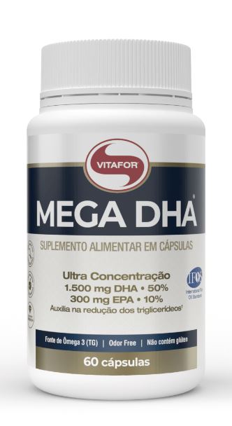 MEGA DHA® Omega 3 com alta concentracao de DHA 60 Capsulas MEGA DHA® e um suplemento alimentar de oleo de peixe em capsulas. Possui alta concentracao de seus derivados. acido docosahexaenoico DHA 1.500 mg e acido eicosapentaenoico EPA 300 mg. extraido atraves de processo de alta tecnologia onde se isenta de impurezas e metais pesados. certificado pelo Programa Internacional de Padroes de Oleo de Peixe IFOS™ . Beneficios Os acidos graxos omega 3 EPA e DHA auxiliam na reducao dos triglicerideos. Diferenciais Ultra concentracao Fonte de Omega 3 TG Possui alta concentracao dos derivados de omega 3 1.500 mg de acido docosahexaenoico DHA e 300 mg de acido eicosapentaenoico EPA Com certificacao do Programa Internacional de Padroes de Oleo de Peixe IFOS ™ . Programa de testes e certificacao de terceiros para oleos de peixe. Definindo os padroes mais altos do mundo em pureza. potencia e frescor Odor free.