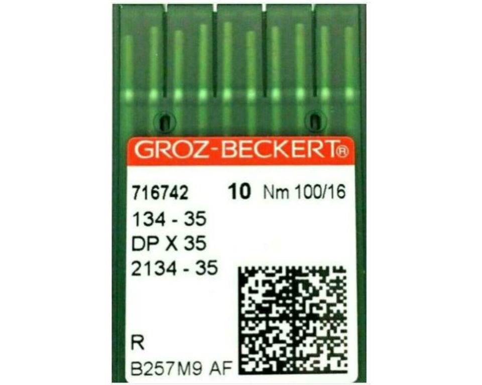 Caixa com 500 agulhas industriais originais Groz-Beckert, modelo 134-35 (DPx35 / 2134-35), ideais para máquinas de costura reta industrial, especialmente em aplicações com materiais pesados como couro, lona, jeans e sintéticos. As agulhas têm espessura Nm 100/16 e ponta universal tipo R, garantindo resistência, precisão e alto rendimento na costura.