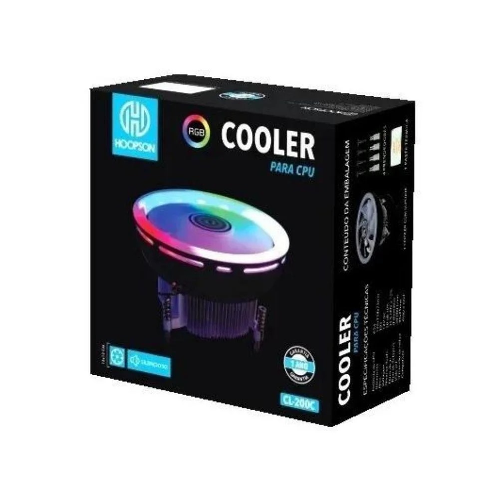 O Cooler Hoopson CL 200C e a solucao ideal para manter seu processador em temperaturas seguras com estilo e eficiencia. Equipado com iluminacao RGB. ele oferece desempenho termico eficiente aliado a um visual moderno para setups gamers e profissionais.